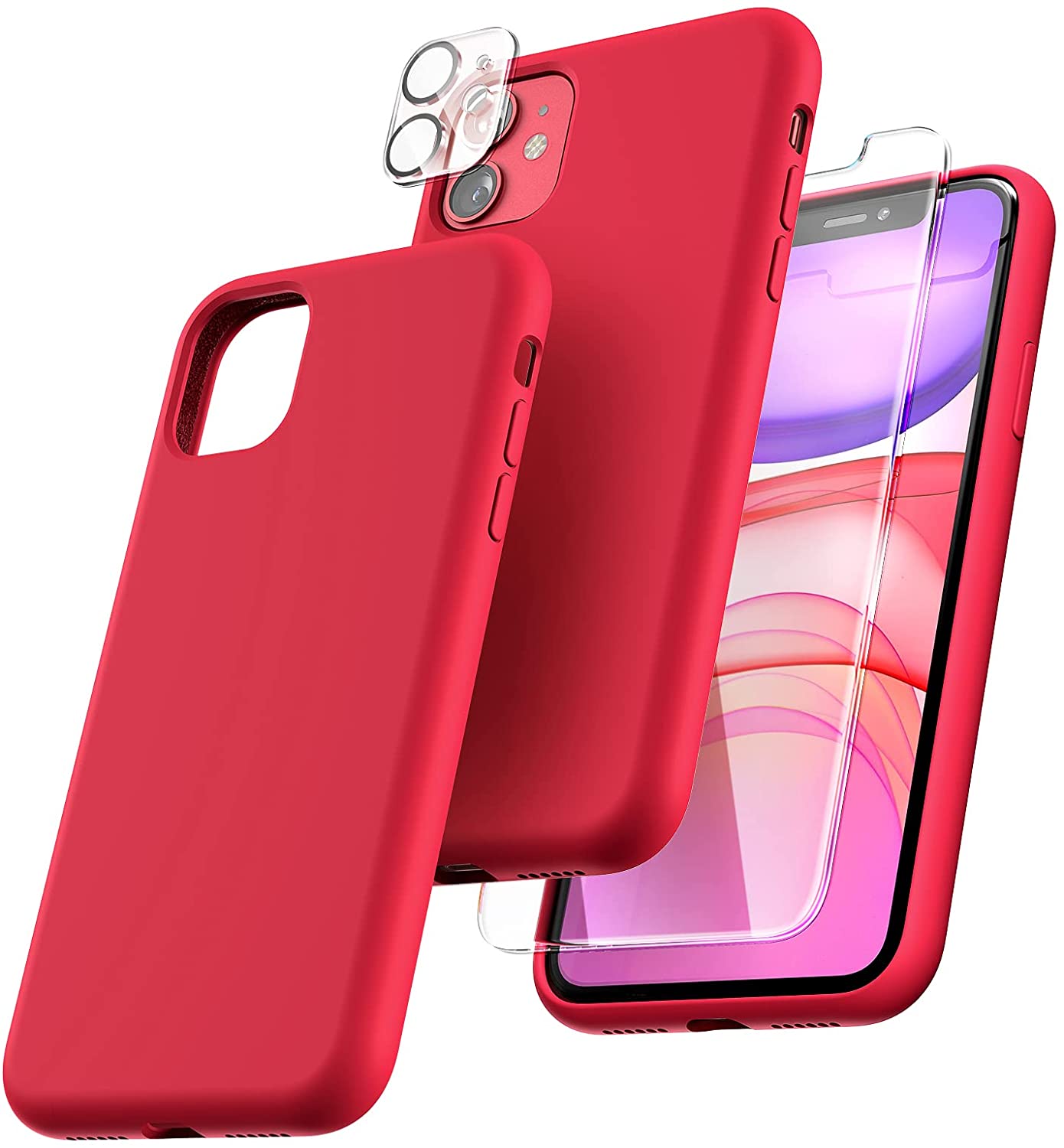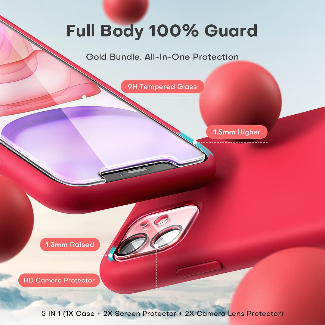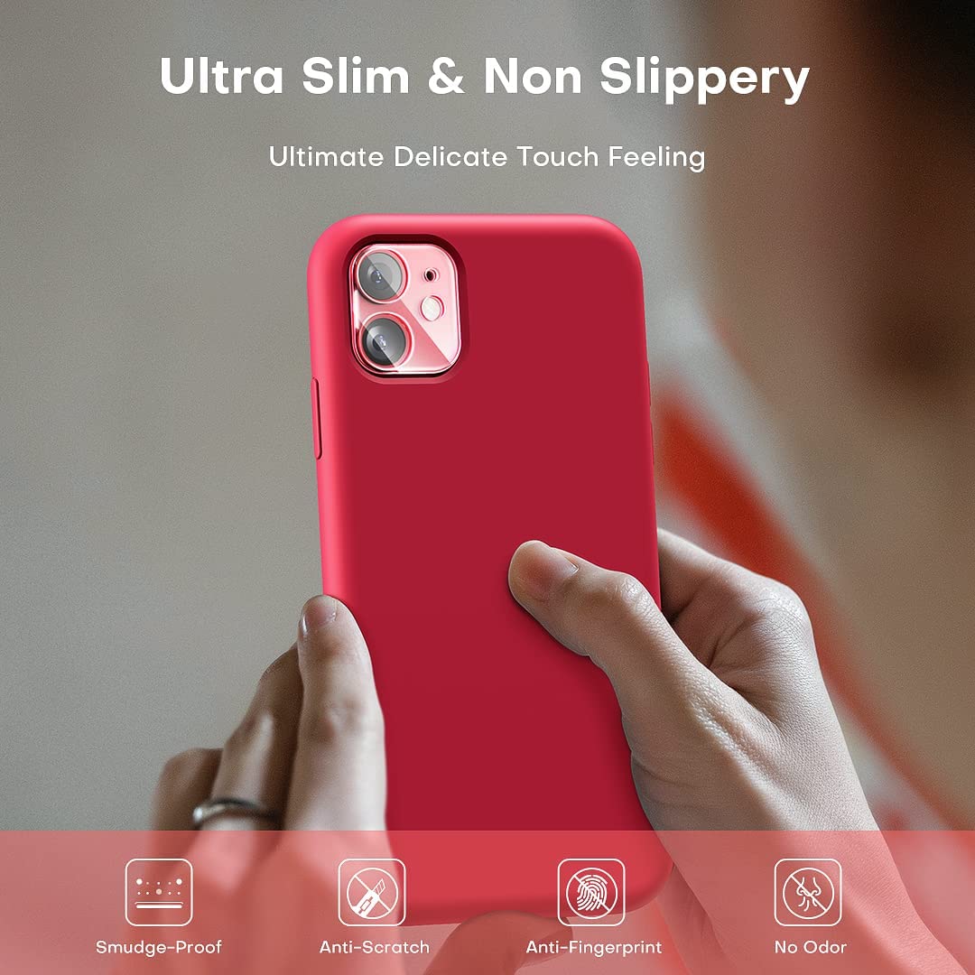 TOCOL [5 in 1] Designed for iPhone 11 Case, with 2 Pack Screen Protector + 2 Pack Camera Lens Protector, Liquid Silicone Slim Shockproof Cover [Anti-Scratch] [Drop Protection], Red