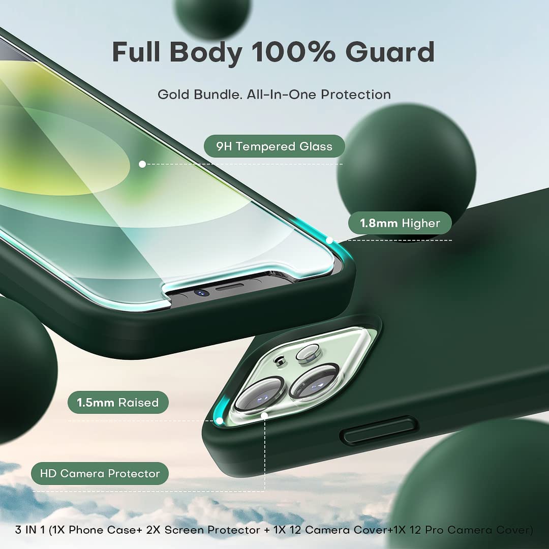 TOCOL [5 in 1] for iPhone 12 Case, for iPhone 12 Pro Case, with 2 Pack Screen Protector + 2 Pack Camera Lens Protector, Silicone Shockproof Phone Case [Anti-Scratch] [Drop Protection], Alpine Green
