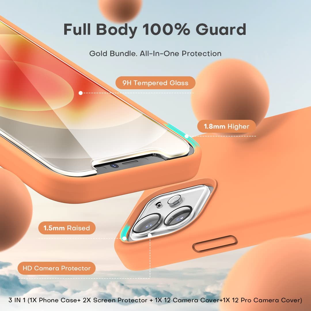 TOCOL [5 in 1] for iPhone 12 Case, for iPhone 12 Pro Case, with 2 Pack Screen Protector + 2 Pack Camera Lens Protector, Silicone Shockproof Phone Case [Anti-Scratch] [Drop Protection], Kumquat