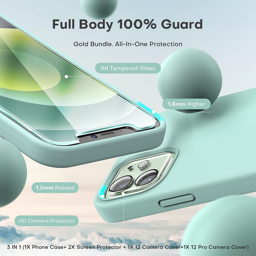 TOCOL [5 in 1] for iPhone 12 Case, for iPhone 12 Pro Case, with 2 Pack Screen Protector + 2 Pack Camera Lens Protector, Silicone Shockproof Phone Case [Anti-Scratch] [Drop Protection], Midnight Green