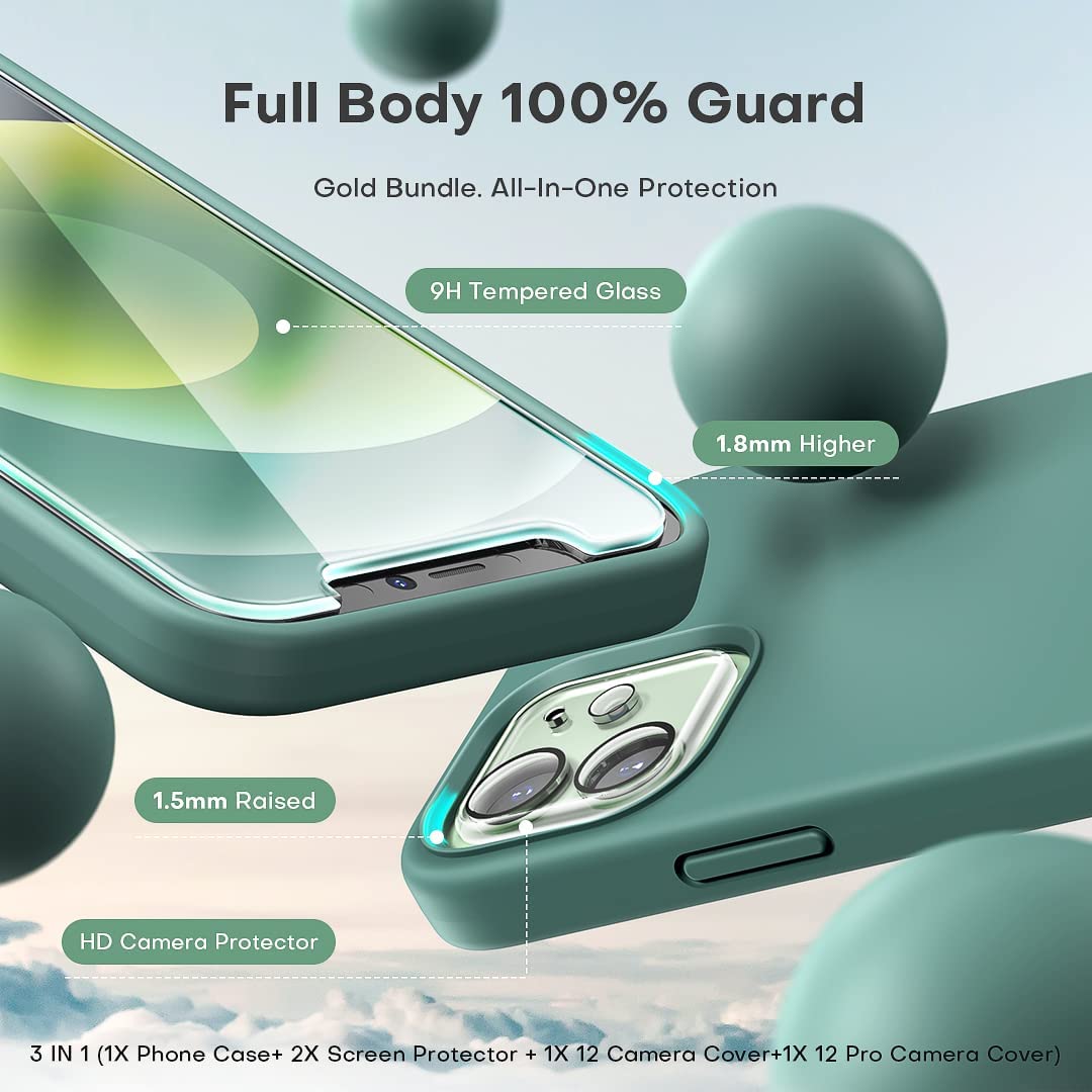 TOCOL [5 in 1] for iPhone 12 Case, for iPhone 12 Pro Case, with 2 Pack Screen Protector + 2 Pack Camera Lens Protector, Silicone Shockproof Phone Case [Anti-Scratch] [Drop Protection], Midnight Green