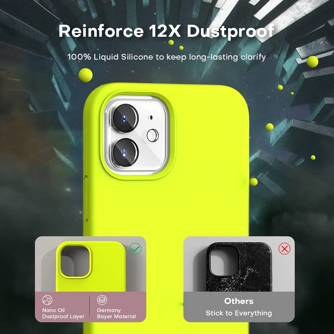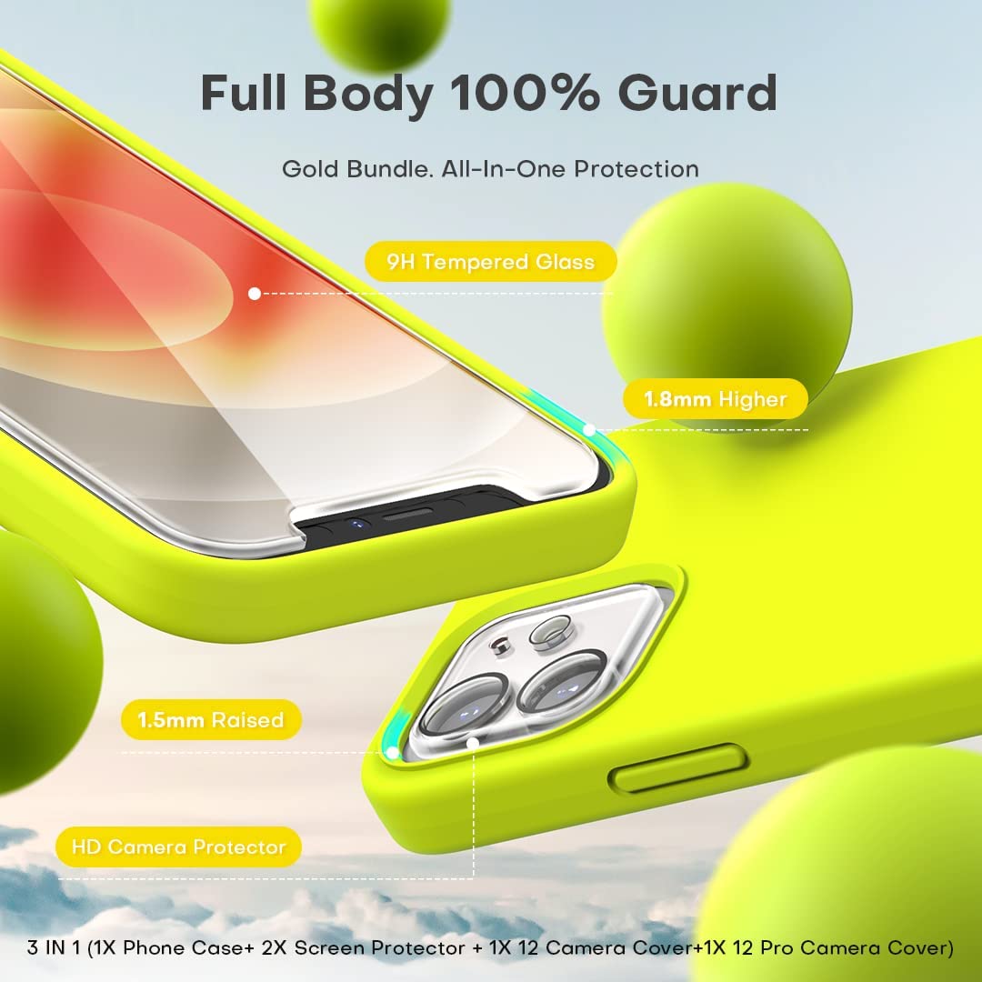 TOCOL [5 in 1] for iPhone 12 Case, iPhone 12 Pro Case, with 2 Pack Screen Protector + 2 Pack Camera Lens Protector, Silicone Shockproof Phone Case [Anti-Scratch] [Drop Protection], Fluorescent Yellow