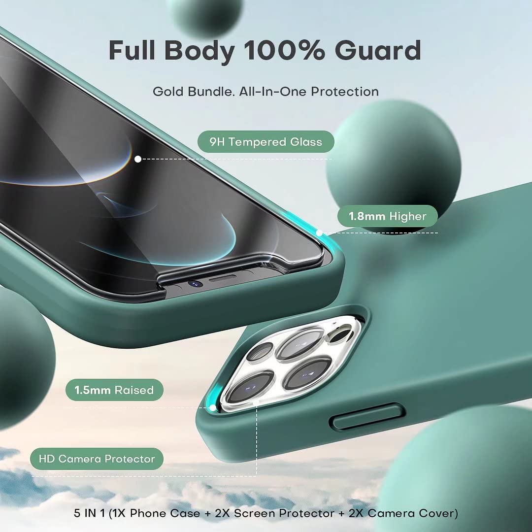 TOCOL [5 in 1] for iPhone 12 Pro Max Case, with 2 Pack Screen Protector + 2 Pack Camera Lens Protector, Liquid Silicone Slim Shockproof Cover [Anti-Scratch] [Drop Protection], Midnight Green