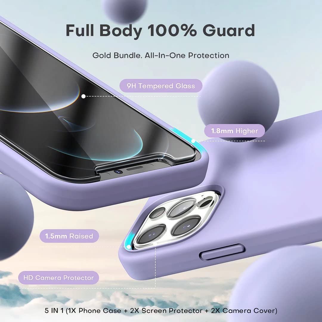 TOCOL [5 in 1] for iPhone 12 Pro Max Case, with 2 Pack Screen Protector + 2 Pack Camera Lens Protector, Liquid Silicone Slim Shockproof Phone Cover [Anti-Scratch] [Drop Protection], Purple
