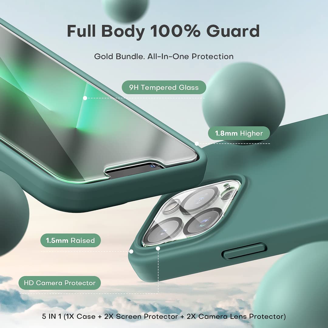 TOCOL [5 in 1] for iPhone 13 Pro Case, with 2 Pack Screen Protector + 2 Pack Camera Lens Protector, Slim Silicone Phone Case iPhone 13 Pro 6.1 Inch, [Anti-Scratch] [Drop Protection], Midnight Green