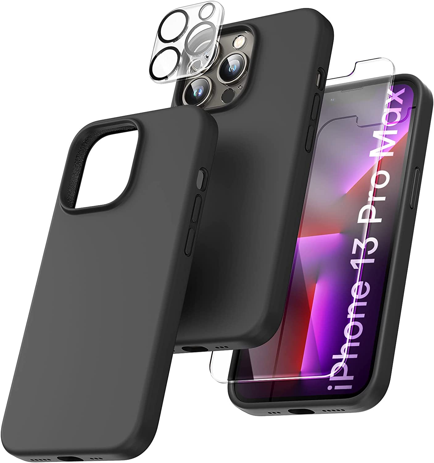 TOCOL [5 in 1 for iPhone 13 Pro Max Case, with 2 Pack Screen Protector + 2 Pack Camera Lens Protector, Slim Liquid Silicone Phone Case 6.7 Inch, [Anti-Scratch] [Drop Protection],Black