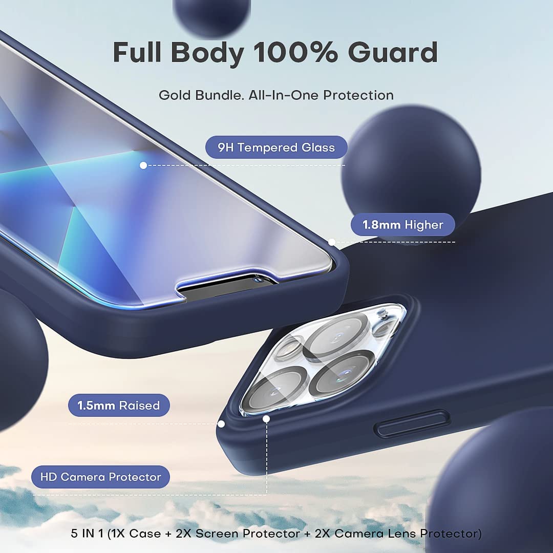 TOCOL [5 in 1] for iPhone 13 Pro Max Case, with 2 Pack Screen Protector + 2 Pack Camera Lens Protector, Slim Liquid Silicone Phone Case 6.7 Inch, [Anti-Scratch] [Drop Protection],Blue