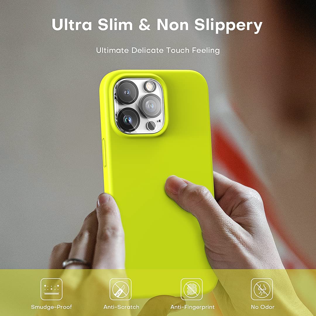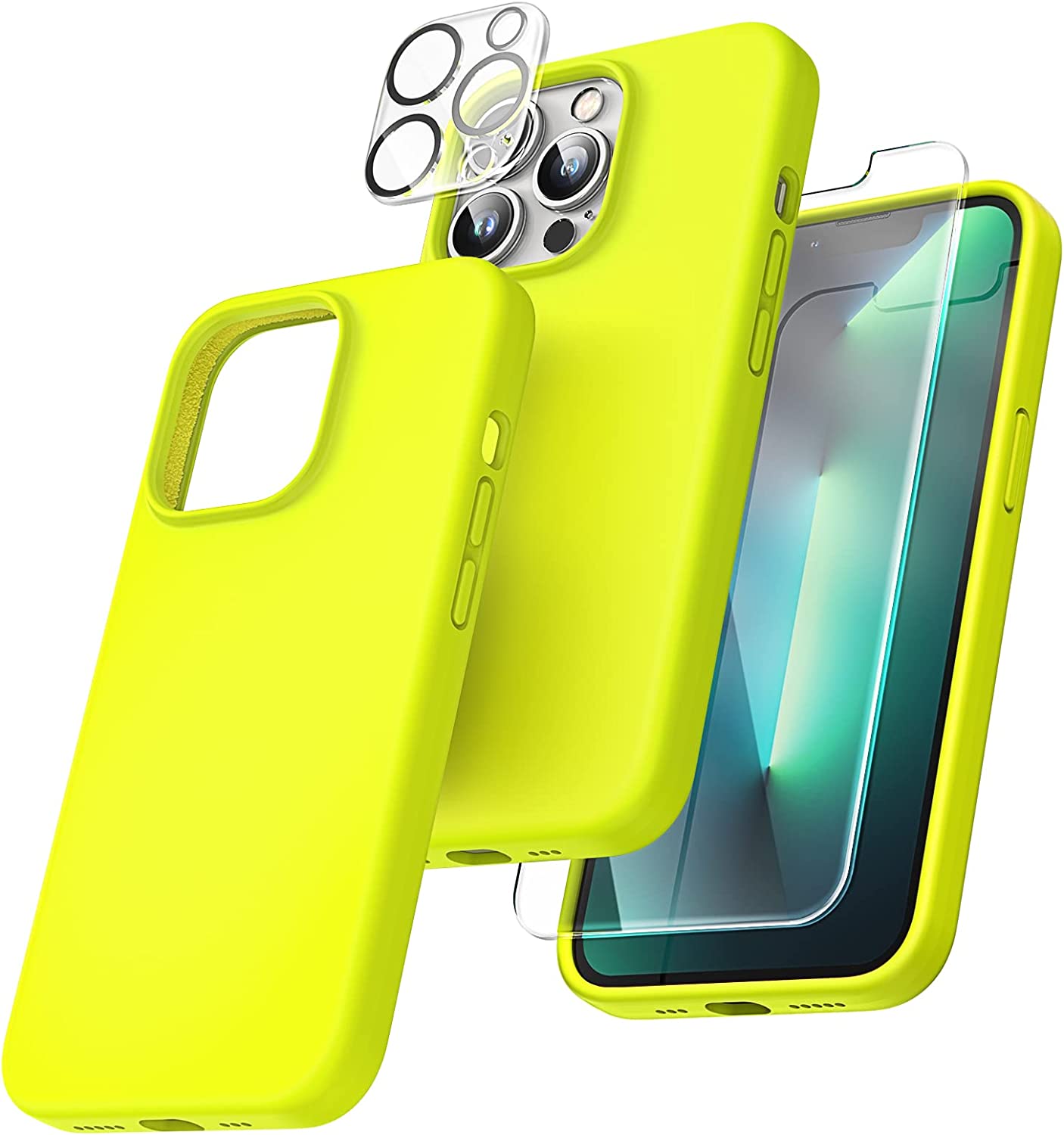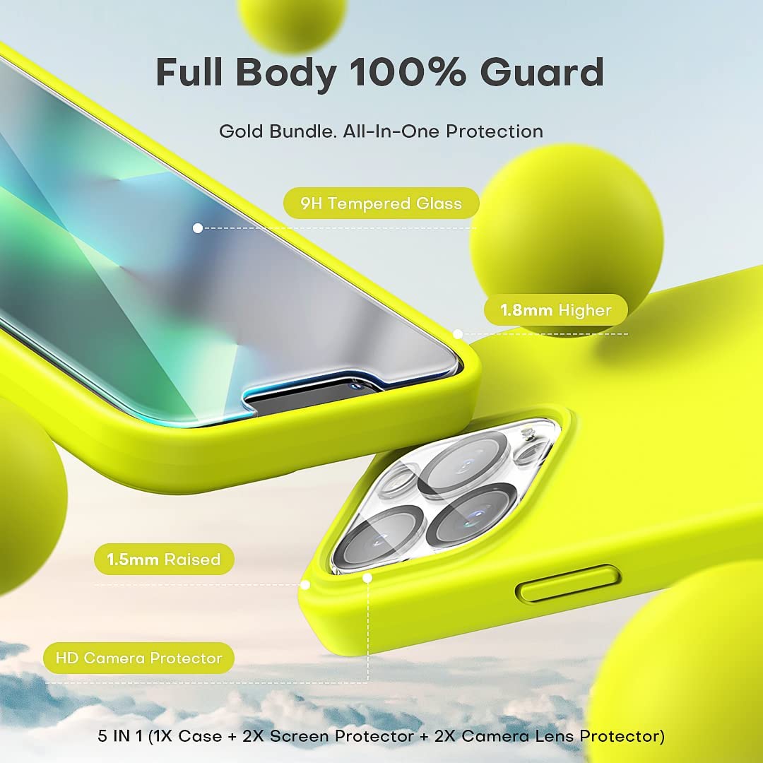 TOCOL [5 in 1] for iPhone 13 Pro Max Case, with 2 Pack Screen Protector + 2 Pack Camera Lens Protector, Slim Liquid Silicone Phone Case 6.7 Inch, [Anti-Scratch] [Drop Protection],Fluorescent Yellow