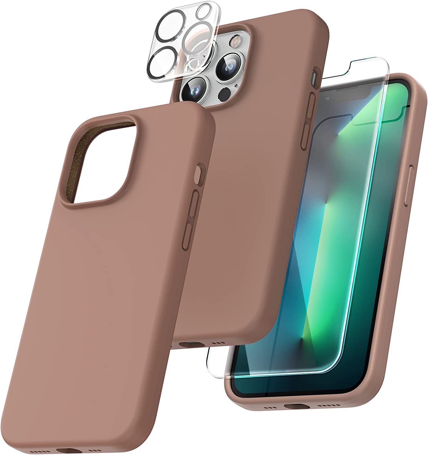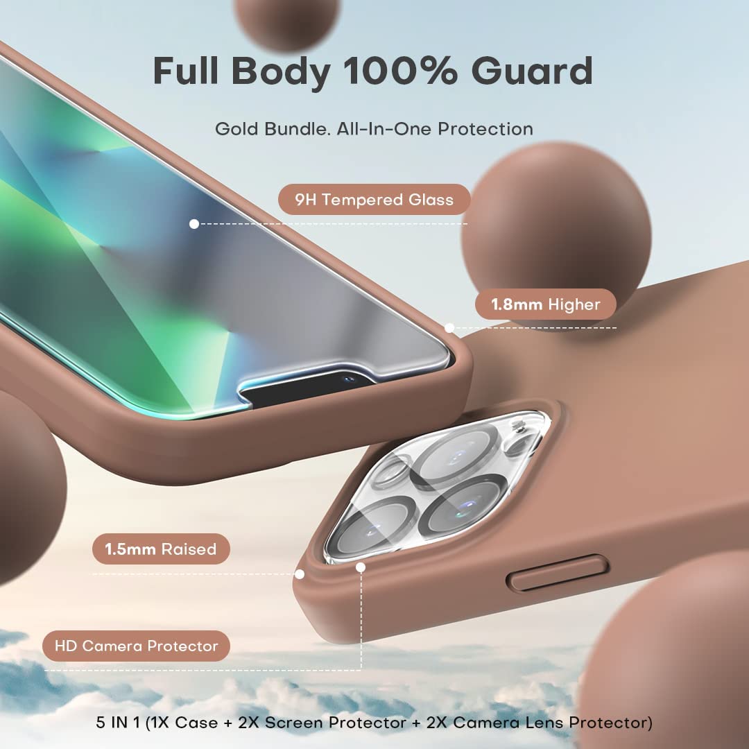 TOCOL [5 in 1] for iPhone 13 Pro Max Case, with 2 Pack Screen Protector + 2 Pack Camera Lens Protector, Slim Liquid Silicone Phone Case 6.7 Inch, [Anti-Scratch] [Drop Protection],Light Brown