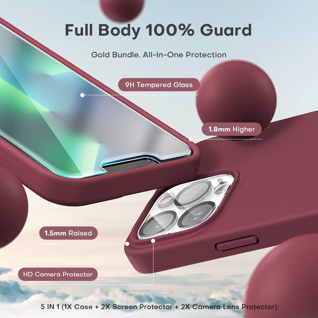 TOCOL [5 in 1] for iPhone 13 Pro Max Case, with 2 Pack Screen Protector + 2 Pack Camera Lens Protector, Slim Liquid Silicone Phone Case 6.7 Inch, [Anti-Scratch] [Drop Protection],Plum