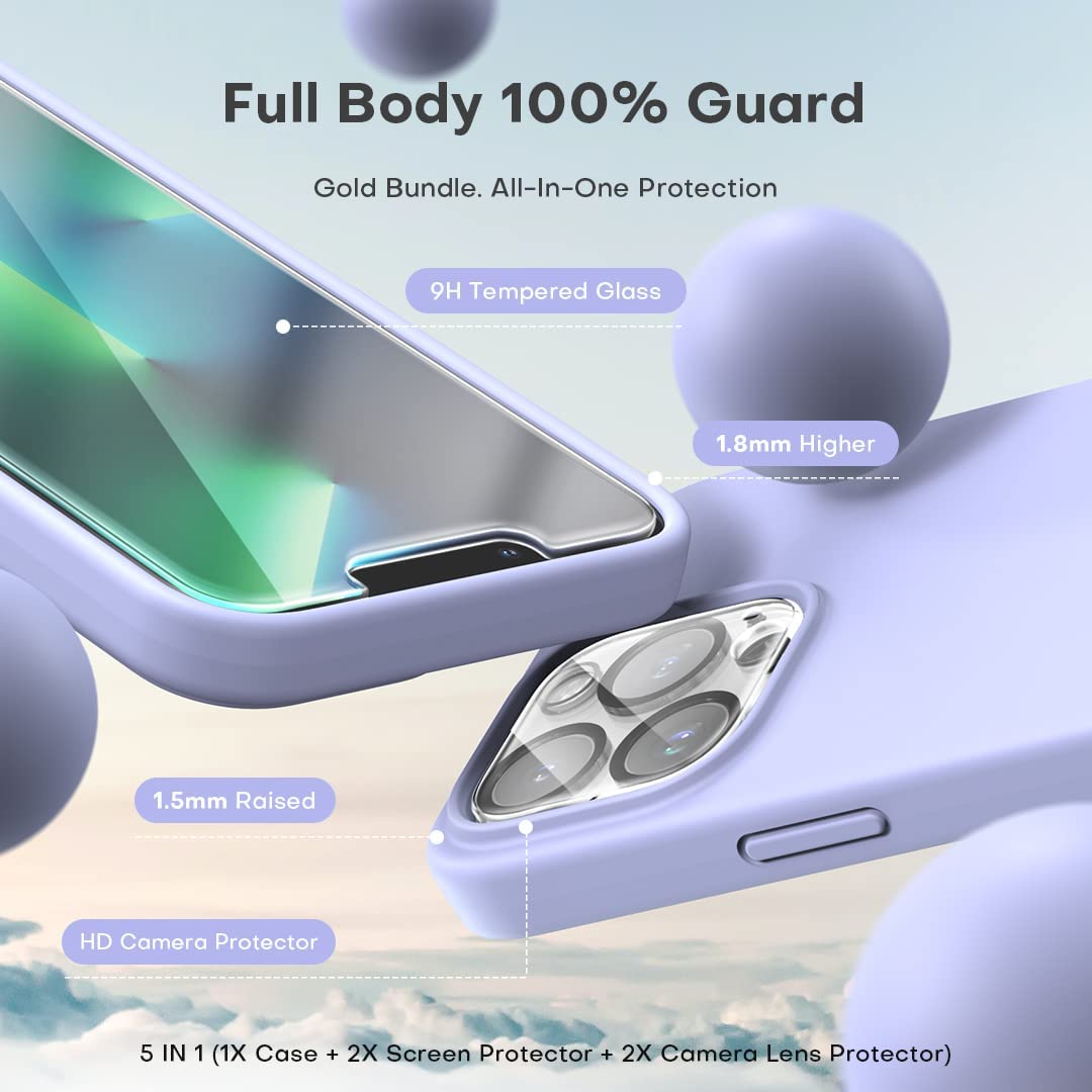 TOCOL [5 in 1] for iPhone 13 Pro Max Case, with 2 Pack Screen Protector + 2 Pack Camera Lens Protector, Slim Liquid Silicone Phone Case 6.7 Inch, [Anti-Scratch] [Drop Protection],Purple
