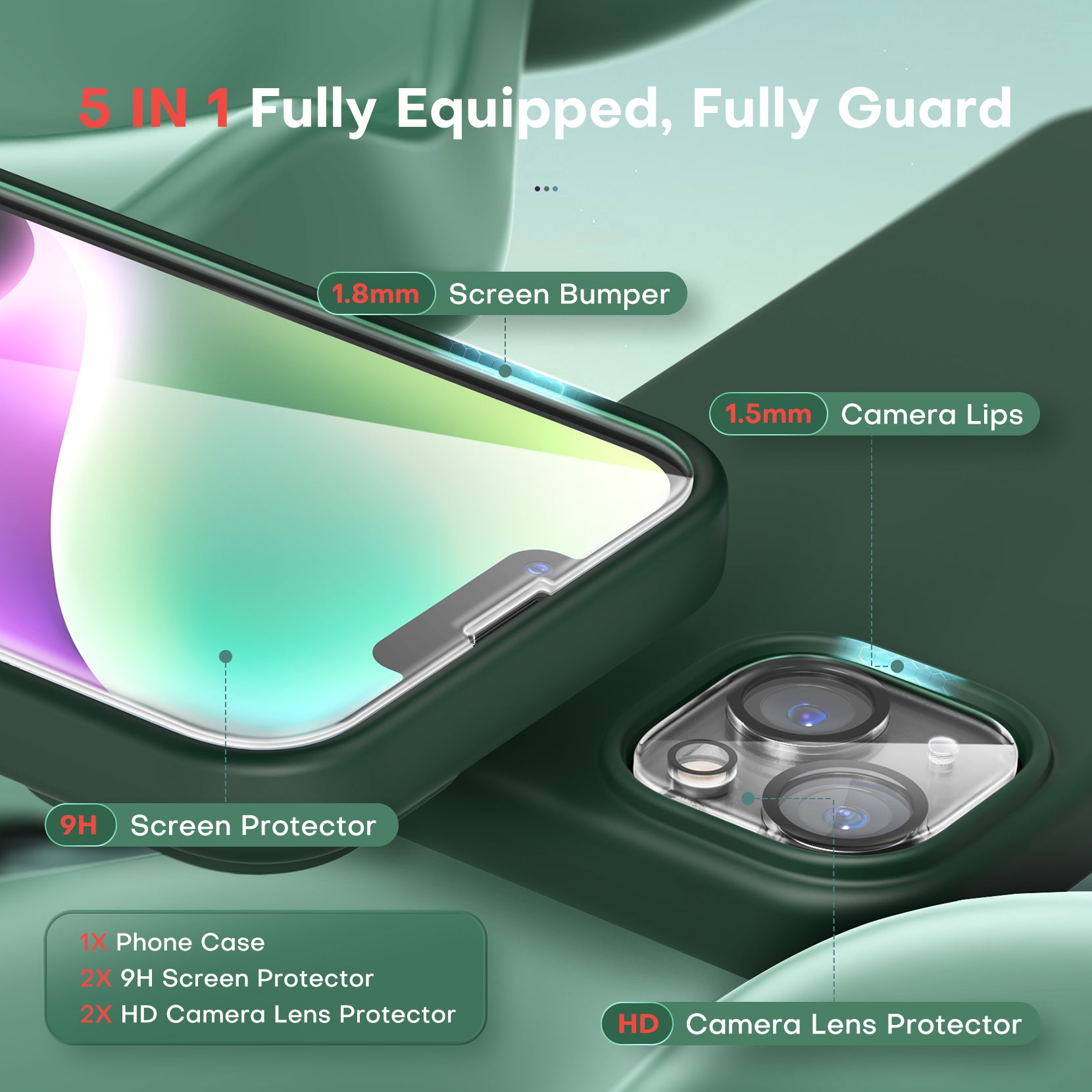 TOCOL [5 in 1] for iPhone 14 Plus Case, 2X Screen Protector + 2X Camera Lens Protector, Slim Liquid Silicone Phone Case iPhone 14 Plus 6.7 Inch, [Anti-Scratch] [Drop Protection], Alpine Green