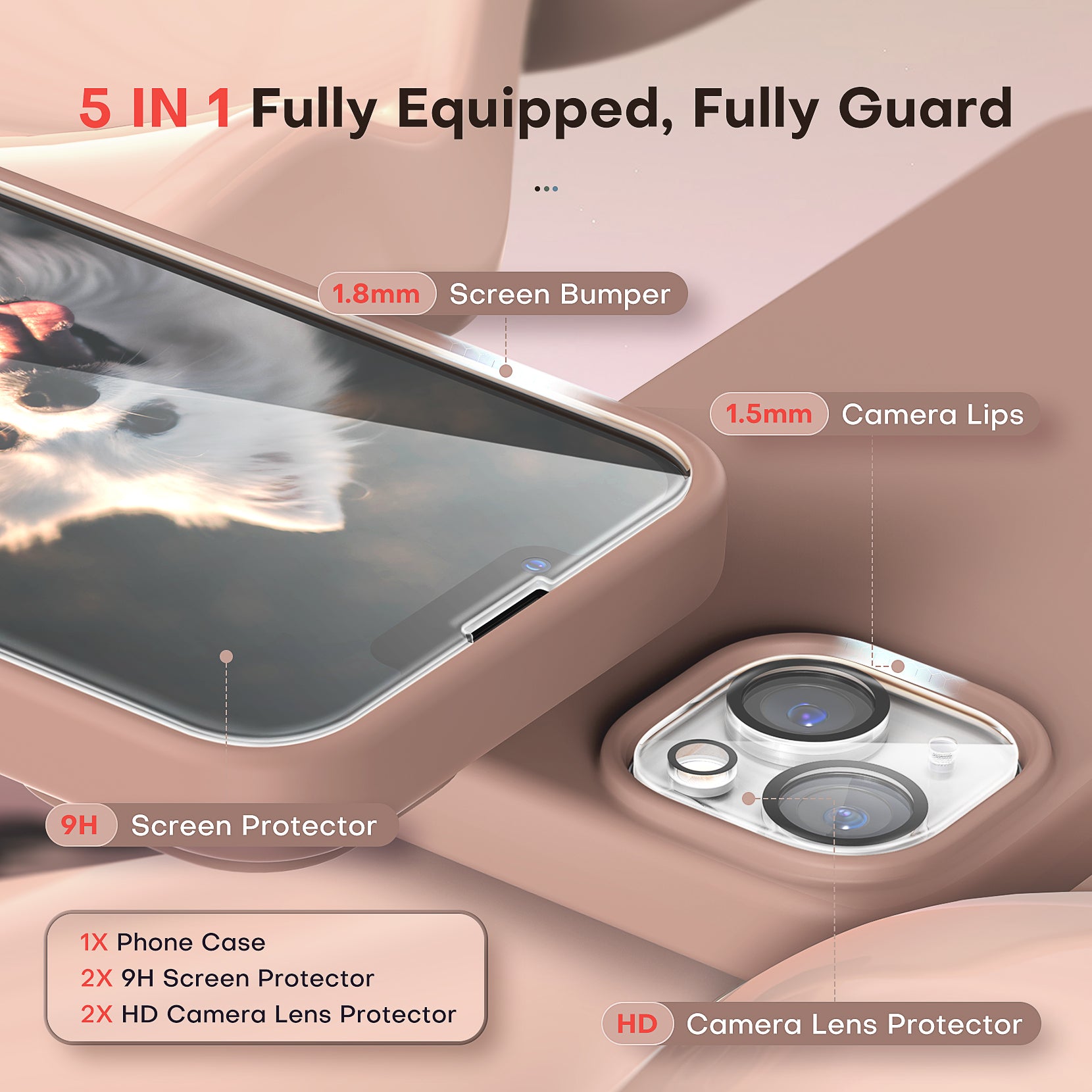 TOCOL [5 in 1] for iPhone 14 Plus Case, 2X Screen Protector + 2X Camera Lens Protector, Slim Liquid Silicone Phone Case iPhone 14 Plus 6.7 Inch, [Anti-Scratch] [Drop Protection], Brown