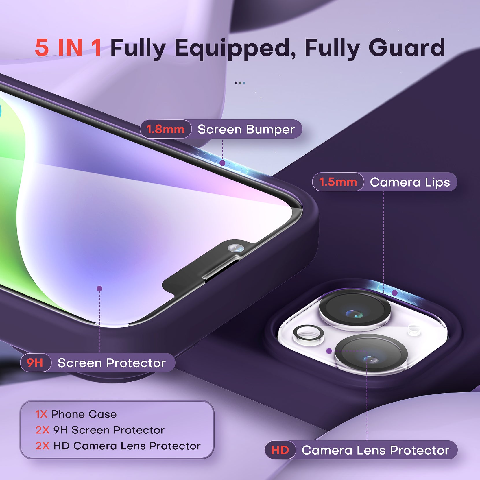 TOCOL [5 in 1] for iPhone 14 Plus Case, 2X Screen Protector + 2X Camera Lens Protector, Slim Liquid Silicone Phone Case iPhone 14 Plus 6.7 Inch, [Anti-Scratch] [Drop Protection], Deep Purple