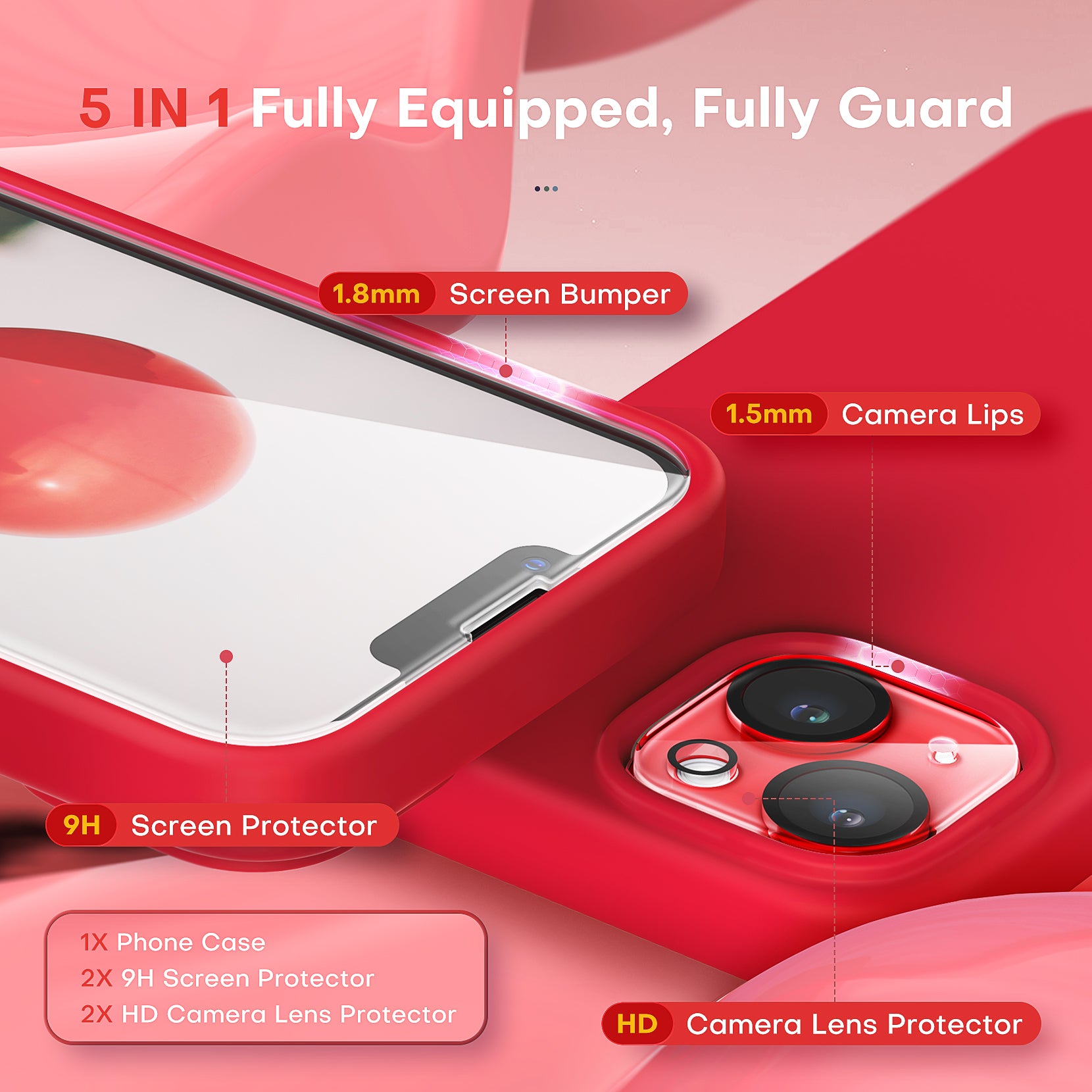 TOCOL [5 in 1] for iPhone 14 Plus Case, 2X Screen Protector + 2X Camera Lens Protector, Slim Liquid Silicone Phone Case iPhone 14 Plus 6.7 Inch, [Anti-Scratch] [Drop Protection], Red