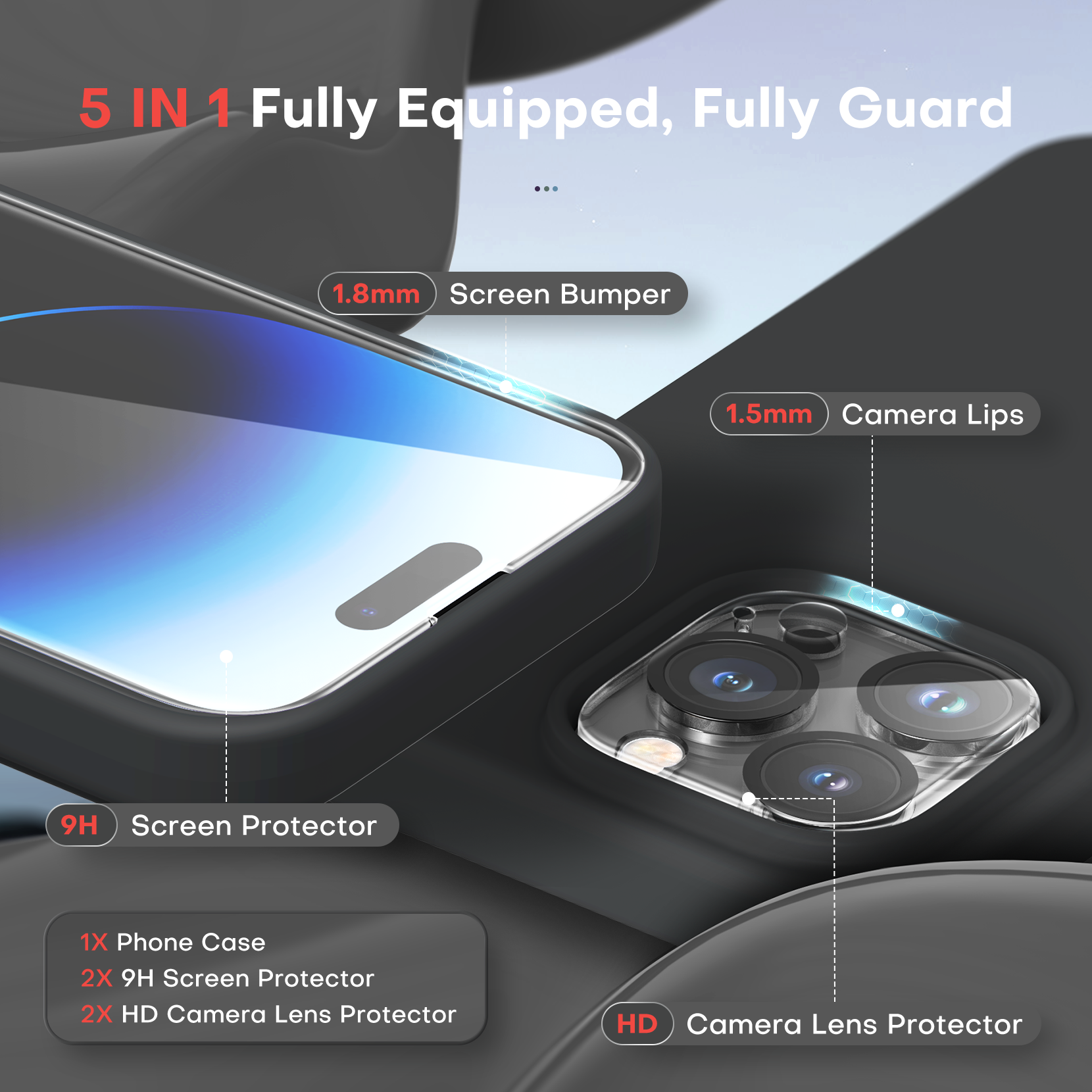 TOCOL [5 in 1] for iPhone 14 Pro Max Case, 2 Screen Protector + 2 Camera Lens Protector, Slim Liquid Silicone Phone Case iPhone 14 Pro Max 6.7 Inch, [Anti-Scratch] [Drop Protection], Black
